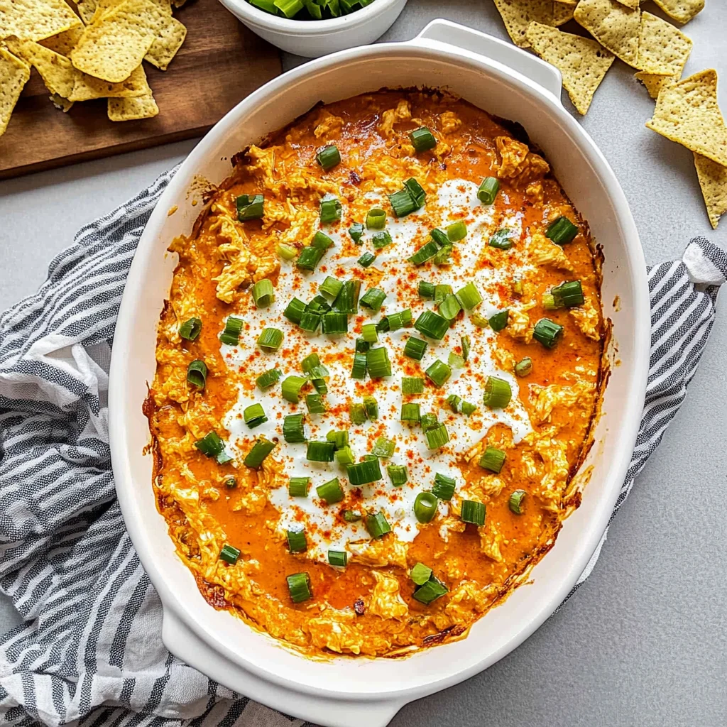 This Healthy Buffalo Chicken Dip is a game-changer, bringing all the bold flavors of the classic dish while cutting down on calories. The combination of juicy shredded chicken and creamy Greek yogurt provides a delightful contrast in texture, ensuring every bite is both satisfying and rich without compromising your health goals. Topped with melty cheddar cheese and finished with a sprinkle of fresh green onions, it not only looks appetizing but also delivers a mouthwatering aroma that will have everyone flocking to the snack table. Perfect for gatherings or a cozy night in, you’ll find yourself craving this dip again and again—so why not whip it up tonight?