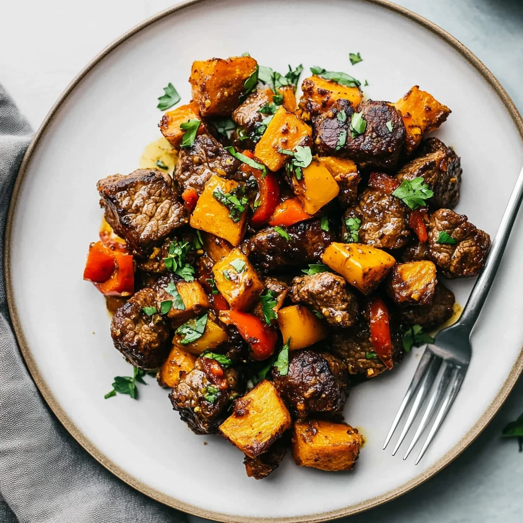 To store leftovers, place them in an airtight container in the refrigerator where they will stay fresh for up to 3 days. When reheating, do so gently on the stovetop over low heat, adding a splash of broth to keep the steak moist and prevent it from becoming tough. While this dish is best enjoyed fresh, you can freeze it for up to a month; just be aware that the texture of the sweet potatoes may change slightly upon thawing.